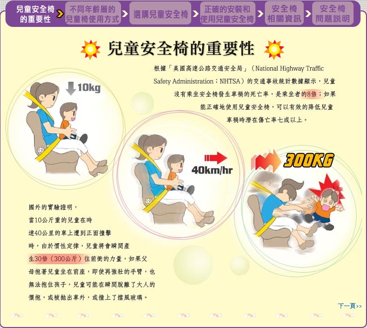 - 年齡在1歲至4歲以下,且體重在10至18公斤之間的幼童,應該坐在「車輛後座」之兒童用座椅,每1個安全椅以乘坐1位幼童為限,以維護兒童乘車安全。